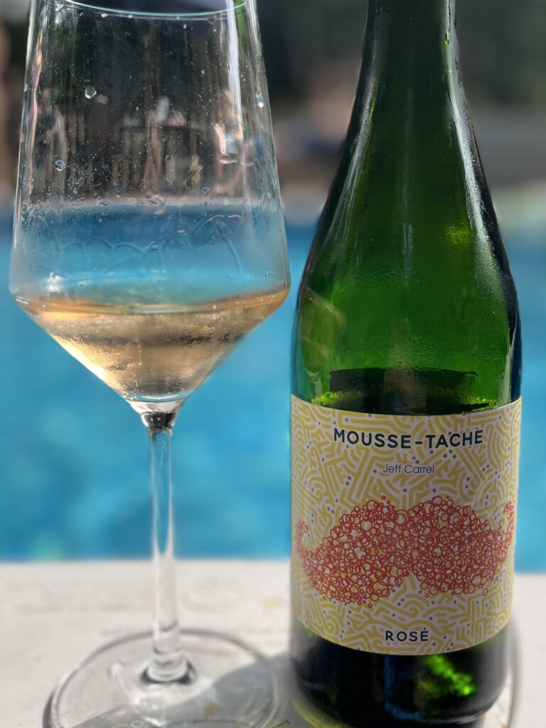 Mousse-Tache Me with a splash of a sparkling that you need poolside … why you ask? Jeff Carrels Mousse-Tache sparklings are both made in the tank method, meaning aged on the lees in stainless steel tanks. During bottling, carbonic gas is introduced into the bottle via an extremely fine membrane, until it has same pressure as in traditional methods. Sealed with a beer cap in the traditional way and meant to be enjoyed yesterday. I was fortunate enough to taste both the Rosé and Extra Brut version side by side Jeff Carrel Mousse-Tâche Rosé Extra Brut Made from 100% Malbec, this rosé sparkling pours into the glass a tickle tangerine salmon with tiniest effervescence. Playful aromas of candied red fruit, blueberry, blood orange, vanilla, tobacco leaf, baking spice and violets. A tense yet lively palate with raspberry, strawberry, mocha, black pepper and violets. The finish is zingy on orange peel with a tart bite of cranberry finish. Jeff Carrel Mousse-Tâche Extra Brut Pours into the glass the softest of yellow with fine tiny bubbles. Made from 100% Chenin Blanc this cheerful wine has delightful nose of white flowers, apple skin, pear, quince, honey and a touch of chalk. The finessed palate bring some flavors of acacia, honeysuckle, chamomile, honeyed apple, pear and orange peel are delicately present on the nose. The finish lets you know you are enjoying a Chenin that lingers on the vervy acidity. Both of these lightly sparkling darlings are thirst-quenching. I served both poolside and pleased all, even the fussiest of fizz drinkers. These wines are all about fun, from the label (front and back) to what sparkles inside.