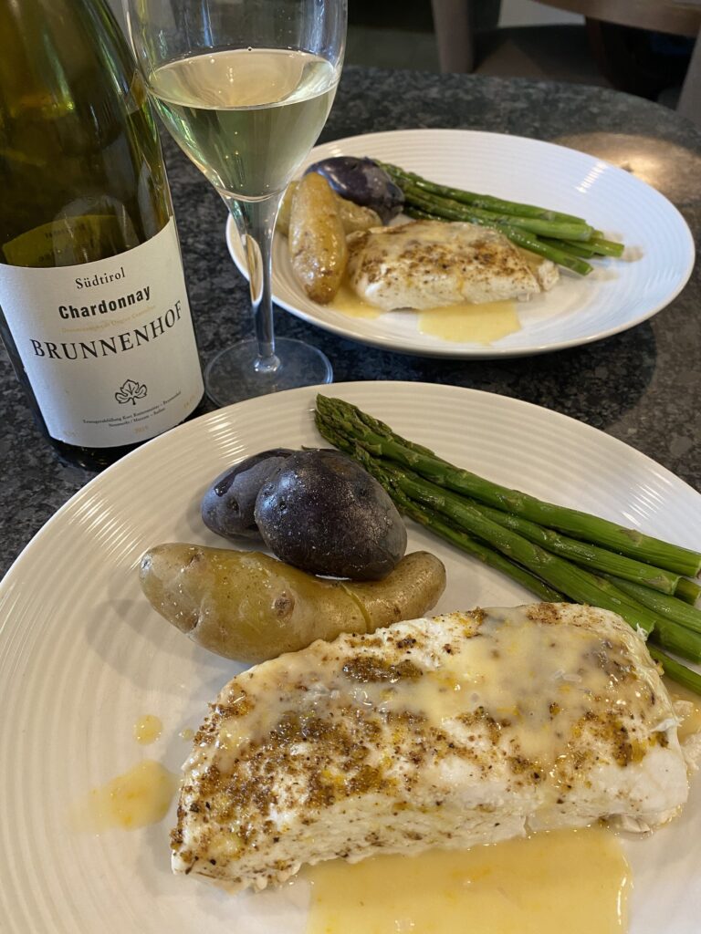 Brunnenhof Mazzon Chardonnay 2019 Südtirol – Alto Adige, Italy Italy’s smallest, Alpine beauty of a wine region, the mountainous glacial valley of Northern Italy region of Trentino-Alto Adige is located just south of Austria. It is made up of 2 separate regions – Trentino and Alto Adige (a.k.a. Südtirol). The regions are heavily influenced by Austrian-Italian cultures. You will find a hodge podge of varietals in the region – from delicate Pinot Noir & Schiava, herbaceous Lagrein and bright refreshing whites such as Pinot Grigio, Chardonnay and Pinot Bianco, aromatic, fuller Gewürztraminer. Brunnenhof is a small-scale family winery with plantings of Pinot Noir, Lagrein, Gewurztraminer and Chardonnay which all thrive in this rugged terrain region. The life and vitality of the grapes are forever present in the final wine thanks to the attention and care they place on their vines. No chemicals, minimal intervention and over a hundred years of winemaking traditions carried out by the Brunnenhof family ensures the reflection of the terroir and varietals fully express themselves in their wines. The Chardonnay vines are new to the family estate as of 2018. The hilly soils are rich in minerals, sand and gravel. The grapes are crushed and macerated for 24 hours and then fermented in 500 liter oak barrels. The wine is aged further for 10 months on the lees in the oak barrels. Only 2000 bottles were produced. Pours in the glass a medium lemon color. Swirls and bam! You’ve just picked the most perfect, ripe golden apples, pears, lemons, white peaches and apricots mingled with a bouquet of honeysuckle. Sip and the creamy texture is balanced with the lively acidity. The expressive, fresh flavors are delicate and fruity with a beautiful minerality – golden apple, pear, apricot, honey, honeysuckle, wet stone, buttery, petroleum (very subtle). It finishes on a slight herbal minty/fennel note and baked lemon pie. Absolutely amazing – the flavors, acid and alcohol (I didn’t notice the 14.5% abv at all!) – it was so well balanced and integrated. Sublime with roasted halibut (olive oil, ground toasted fennel seeds, orange zest, salt and pepper) with orange beurre blanc, fingerling potatoes and roasted asparagus. The wine amplified the orange zest in the sauce and fish. I have to say it was one of the best meals I have ever made.