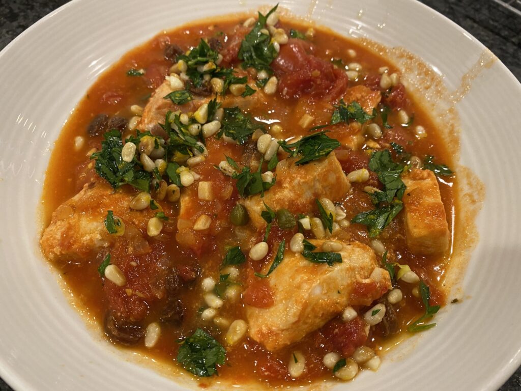 1/4 cup each pine nuts, toasted and chopped fresh mint (or parsley) 4 cloves garlic, minced 1 tsp. grated orange zest 2 tbsp. olive oil 2 onions, finely chopped 1 celery rib, mned salt and pepper 1/4 tsp. dried thyme pinch red pepper flakes 1/2 cup dry white wine 1 28oz can whole peeled tomatoes, drained with juice reserved, coarsely chopped 1 cup clam juice 1/4 cup raisins 2 tbsp. capers, rinsed 1 1/2 lbs skinless swordfish steaks cut into 1 1/2 inch thick pieces Combine pine nuts, mint, orange zest, 1/4 of the garlic in a bowl, set aside for serving. Heat oil in Dutch oven over medium heat until shimmering. Add onions, celery, 1/2 tsp. salt and 1/4 tsp. pepper, cook until vegetables are softened, about 5 minutes. Stir in thyme, pepper flakes and remaining garlic, cook until fragrant, about 1 minute. Stir in the wine, reserved tomato juice and simmer till reduce by half, about 5 minutes. Add clam juice, raisins, capers and tomatoes, simmer for 15 minutes to meld the flavors. Season the swordfish with salt and pepper. Add the swordfish, nestling them into the broth and spoon over some liquid over each piece of fish. Bring to simmer and cook for 4 minutes. Remove from heat and cover, let stand till swordfish flakes apart when gently prodded with a knife, about 5 minutes. Season and serve. Sprinkle with pine nut mixture. Pair with a sparkling Rose or a bright Nerello Mascalese