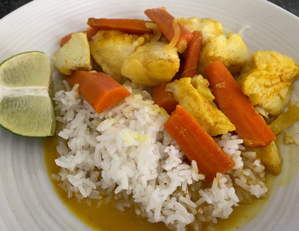 14-ounce can coconut milk 2 medium carrots, peeled, halved lengthwise, and cut into ½-inch pieces 1 medium yellow onion, halved and thinly sliced 6 medium garlic cloves, finely grated 2 teaspoons ground turmeric 2 teaspoons curry powder ½ teaspoon red pepper flakes 1 cup low-sodium chicken broth 1½ pounds skinless, firm white fish fillets, cut into 2-inch chunks Kosher salt and ground white pepper Lime wedges, to serve In a large Dutch oven over medium-high heat, combine the coconut milk, carrots, onion, garlic, turmeric, curry powder, and pepper flakes. Bring to a simmer, then reduce to medium and cook uncovered while stirring occasionally, until the carrots are tender and the liquid has thickened to the consistency of heavy cream, about 10 minutes. Stir in the broth and bring to a simmer over medium-high heat. Season the fish with salt and white pepper, then place in the pot and stir gently. Cover, reduce to low, and cook until the fish flakes easily when poked with a fork, 7 to 10 minutes. Taste and season with salt and pepper. Serve with lime wedges. Serve with Steamed Jasmine Rice and a fresh glass of Gewürztraminer or Off-Dry Riesling