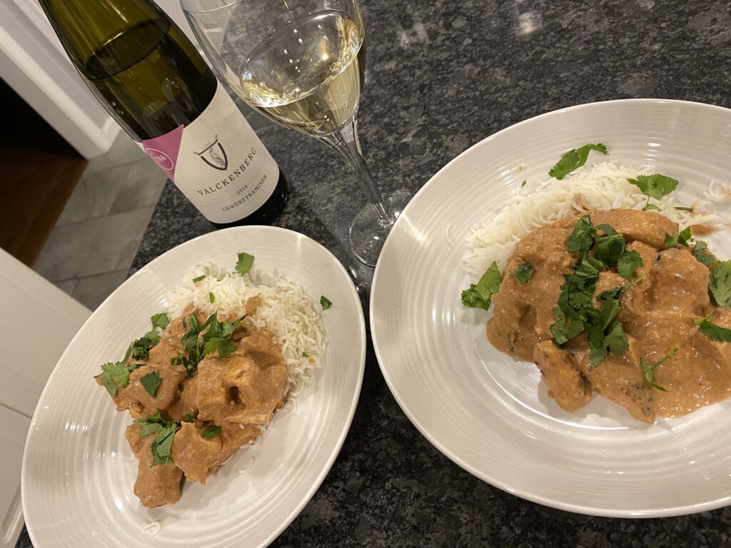 Gewürztraminer is an intensely aromatic wine. FACT: one of the 18 Classic Noble Grapes. It is low acidity, full bodied, oily texture and low to medium alcohol (varies depending on the style and where it’s grown). The grapes skins are light pink which gives the wine a light golden color. Super undervalued, many great examples under $20! Sweet aromatics of lychee, rose petals, red grapefruit, tangerine, pineapple, peach, apricot, orange blossom, cantaloupe, honey, ginger, allspice, cinnamon. Where? It finds its home mainly in Alsace, France; Austria, Germany, Italy (Alro Adige), USA (California and Washington), Australia, New Zealand, Ukraine, Hungary. Gewürztraminer can be found in dry, off dry versions to to top quality sweet Alsatian Gewürztraminer “Vendange Tardive’ (a.k.a. ‘late harvest’). Ideal pairing for Indian and Moroccan Cuisines. P. J. Valckenberg Gewürztraminer 2018 from Pfalz, Germany: Aromas of orange blossom, lychee, peach, pear, apple, grapefruit, wet stone. Palate is off dry, medium- acid, low alcohol, medium body, creamy texture. Just delicious with Butter Chicken.