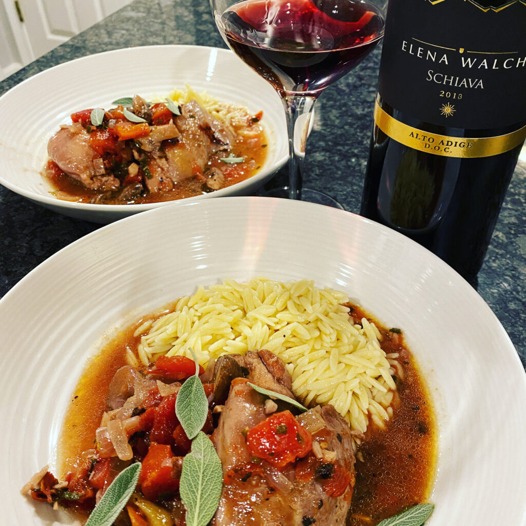 Chicken Cacciatore, in Italian is a hunters stew, is a a rustic meal of chicken braised in a rich red wine tomato and mushroom sauce 😋 it is rich in flavor, soulfully statisfying and makes tons to have leftovers the next day. I served it with buttered orzo. 8 (5- to 7-ounce) boneless chicken thighs, trimmed + 3 tbsp. salt for the night before (see below) 2 1/4 tsp. sea salt 3/4 tsp pepper 1 tbsp extra-virgin olive oil 1 onion, chopped 6 oz portobello mushroom caps, cut into 3/4-inch pieces 1 red pepper, seeded and cut into 3/4-inch pieces 4 garlic cloves, minced 2 tsp minced fresh thyme 1/4 teaspoon red pepper flakes (optional) 1 1/2 tablespoons all-purpose flour 1 1/2 cups dry red wine 1/2 cup chicken broth 1 (14.5-ounce) can diced tomatoes, drained 1 Parmesan cheese rind (optional; see note) 2 tsp chopped fresh sage The night before cooking, season the chicken all over with sea salt. Don’t worry the meat won’t be salty. What will happen is the salt through osmosis will tenderize and retain moisture in the chicken and dry out the outter layer making it more crispy when cooked. Adjust oven rack to middle position and heat oven to 300 degrees. Pat chicken dry with paper towels and season with 1 3/4 teaspoons salt and the pepper. Heat oil in Dutch oven over medium-high heat until just smoking. Brown thighs, 5 to 6 minutes per side. Transfer thighs to plate; discard skin. Pour off all but 1 tablespoon fat from pot. Add onion, mushrooms and peppers plus the remaining 1/2 teaspoon salt to fat left in pot and cook, stirring occasionally, until softened and beginning to brown, 6 to 8 minutes. Stir in garlic and thyme and cook until fragrant, about 30 seconds. Stir in flour and cook for 1 minute. Slowly whisk in wine, scraping up any browned bits and smoothing out any lumps. Stir in broth, tomatoes and cheese rind, if using, and bring to simmer. Nestle thighs into pot, cover and transfer to oven. Cook until chicken registers 195 degrees, 35 to 40 minutes. Remove pot from oven and transfer chicken to serving platter. Discard cheese rind, if using. Stir sage into sauce and season with salt and pepper to taste. Spoon sauce over chicken and serve. Note: The Parmesan cheese rind is optional, but we highly recommend it for the savory flavor it adds to the dish. Paired with a Schiava from Elena Walch vineyards, located in Alto Adige, Italy. Tomato based sauces need a higher acid wine to balance the dish and make it sing.