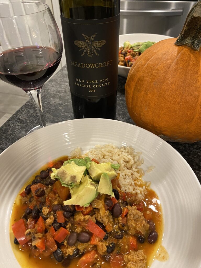 1 pound 93% fat free ground turkey 1 tbsp. ground chili or smoked paprika (Pimenton) 1 1/2 tbsp. ground cumin 1 tbsp. ground coriander 1 tsp. dried oregano 1 tsp. sweet paprika 1 (28oz) can fire roasted tomatoes 2 tbsp. olive oil 1 onion, chopped fine 2 red bell peppers, seeded and chopped into 1/2 inch pieces 5 garlic cloves, minced 1 cup unsweetened pumpkin puree 2 cups water 2 tbsp. brown sugar 2 (15oz) cans black beans, rinsed Heat a large Dutch oven over medium heat. Add oil, onions, bell peppers, 1/2 tsp salt and cook until softened, 8 minutes. Increase heat to high and add in the turkey. Cook, breaking up with a wooden spoon, until no longer pink, 4-6 minutes. Stir in the spices and garlic. Stir in pumpkin, tomatoes and water, bring it to a simmer. Reduce heat to low, cover and cook, stirring occasionally, for 1 hour.. Stir in beans and brown sugar and cook until thickened, 30 minutes. Season with salt to taste. Serve with Sour cream, cubed avocado and brown rice. Serves 8 Pair with a California Zinfandel or Washington Cabernet Sauvignon.