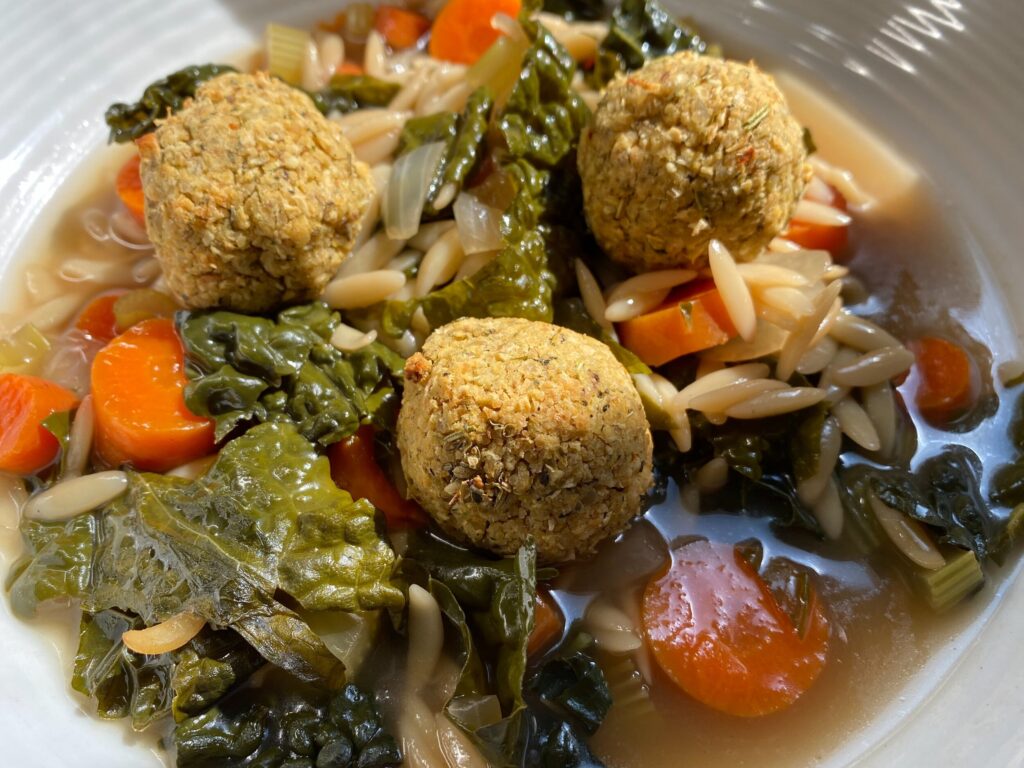 White Bean Balls 1 large yellow onion 3 cups cooked navy beans, fresh or canned, drained 1/2 cup bread crumbs 3 cloves garlic, minced 1/4 cup nutritional yeast or flour 3 tbsp. olive oil 1 tbsp. soy saue 2 tsp. no salt all purpose seasoning blend – I used Bragg’s 1 tsp. each dried thyme and oregano Soup 1 tbsp. olive oil 2 ribs celery, chopped 3 carrots, chopped 2 cloves garlic, minced 1 cup orzo pasta 8 cups vegetable broth 4 cups lacinato kale, washed, ribs removed and sliced 1/2 tsp. each sea salt and freshly ground pepper Grated Parmesan cheese, for garnish (omit if vegan) Freshly grated parmesan cheese ( for garnish) Preheat the oven to 400F. Coat a baking sheet with cooking spray. Chop the onion, and set aside ( 1/4 cup for the balls, the remainder for the soup). In a food processor, add the beans. Puree till chunky. Add in the 1/4 cup onion & remaining ingredients and puree till it all sticks together. If too dry add a tbsp. of water at a time. Make golf ball size bean ball withs the mixture and place on the cookie sheet. Bake for 20-25 minutes until golden brown. Meanwhile heat a Dutch oven on the stove to medium heat. Heat the olive oil and then add the rest of the onion, carrot, celery and garlic and sauté until the onion starts to brown about 3-5 minutes. Add the pasta and gently pour in the broth and let simmer till the pasta is tender, about 10 minutes. Fold in the greens, salt and pepper. Turn the heat off. When ready to eat, put 3-4 bean balls in the bottom of a soup bowl. Laddle the soup gently over the balls. They will soften pretty quickly.