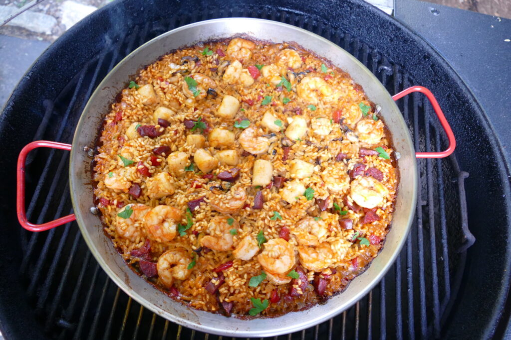 1 lb. jumbo shrimp (16-20 per pound) peeled and deveined 1 tbsp. extra virgin olive oil 6 cloves garlic, minced 1 3/4 tsp smoked paprika 3 tbsp. tomato paste 4 cups fish broth 2/3 cup dry sherry 8oz bottle clam juice pinch of saffron threads 1 small onion, finely chopped 1/2 cup roasted red peppers, chopped 3 cups paella or arborio rice 1 lb. bay scallops, cleaned 1 lb. spanish chorizo, cut into 1/2 inch pieces 1 lb. mussels or little neck clams (optional) Toss shrimp with 1 tbsp. oil, 1/2 tsp. garlic, 1/4 tsp. paprika and 1/4 tsp. salt in a bowl until coated. Heat a small saucepan over medium heat on the stove. Add 1 tbsp olive oil and remaining garlic, cook, stirring constantly until the garlic sticks to the bottom and begins to brown, about 1 minute. Add tomato paste, remaining 1 1/2 tsp paprika and cook, stirring until dark brown bits form at the bottom of the pan. Add the broth, sherry, clam juice and saffron. Increase heat to high and bring to a boil. Set aside. Heat the grill to 350F. Add the pan and 4 tbsp. of olive oil till shimmering. Heat the grill for about 15 minutes until the grill is hot. Place the paella or roasting pan on the grill and add remaining 1/4 cup of oil. When oil begins to shimmer, add in the chorizo, onion, and peppers. Cook for 4-7 minutes. Add the rice and stir until grains are coated. Pour in broth over the mixture and smooth rice all around. When liquid reaches a gentle simmer, place shrimp all over pan in a single layer. Arrange scallops around the pan. Cook, moving and rotating the pan to maintain a gentle simmer, until rice is almost cooked through, 20-30 minutes. Continue to cook uncovered until bottom forms a golden crust at the bottom of the pan, add the clams and cook for another 8-15 minutes. Remove from the grill, cover with foil and let sit for 10 minutes. Serves 6.