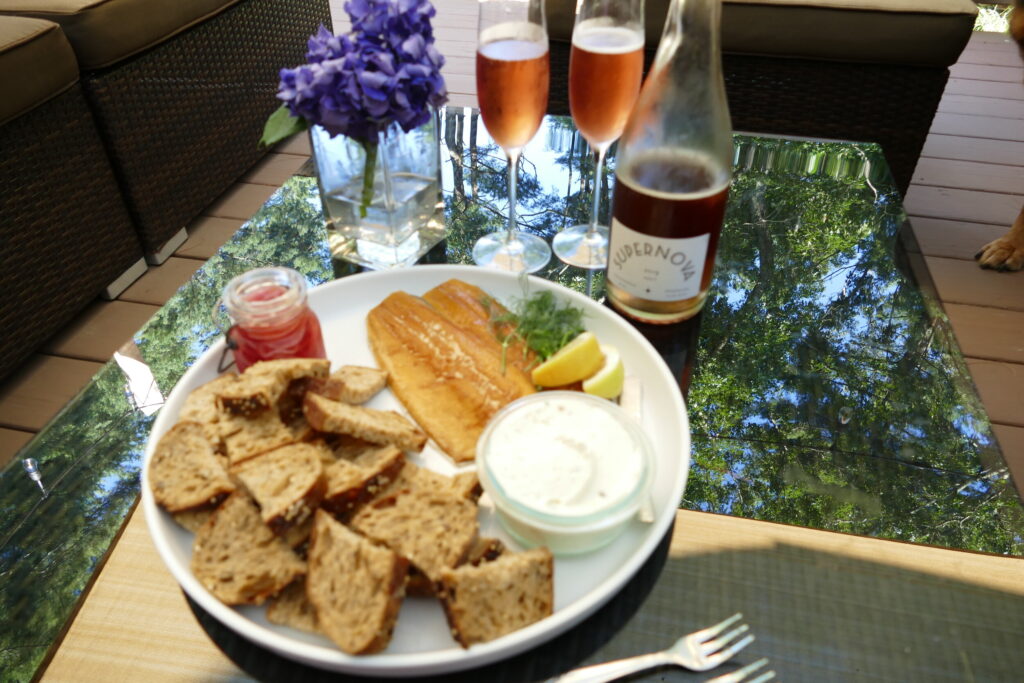 Summer is officially here ladies and gentlemen. You are entertaining, at social distance of course, and you want to serve something quick, delicious and decadent. What to do?!? I have the answer ….. Smoked Trout with Chive Lemon Cream. It requires little preparation with great results. Feel free to substitute smoked salmon or mackerel for the trout. This recipe is courtesy of my friend Deana Simmons – thanks for the idea! 2 filets of smoked trout 1 pkg cream cheese, brought to room temperature 3 tbsp plain greek yogurt 1 tbsp chopped capers, drained and rinsed 1 tbsp fresh chives, minced 1 tsp grated lemon zest salt and pepper to taste 1 loaf multi grain bread, sliced and cut into serving pieces 1 lemon, cut into wedges Mix the cream cheese cheese and greek yogurt together in a bowl. Add the capers, lemon zest, chives, salt and pepper. Mix together and adjust seasonings to taste. Place the cream in a small serving bowl. Serve on a platter with the trout, bread and chive lemon cream. Serve with a sparkling wine, such as Supernova Rosé Sparkler as seen in the picture.