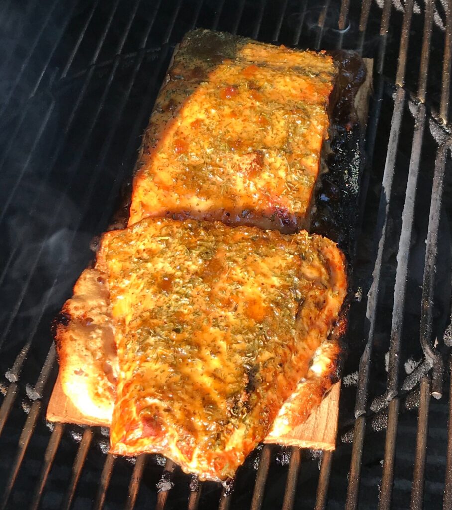 2 lbs. center cut salmon filet 2 tbsp. Dijon mustard 2 tbsp. brown sugar 1 tsp. Herbes de Provence salt and pepper 1-2 cedar planks – depending on how large the salmon filets are Soak the cedar planks in water for at least 2 hours. When ready to cook, heat the grill (we use a charcoal grill which adds extra smokiness to the salmonl) to medium heat 350F. Once hot, place the cedar plank on the grill. When it starts to smoke prepare the salmon. Place the salmon skin side down on a plate. Top with Dijon mustard, Herbes de Provence, salt and pepper and brown sugar last. The sugar will dissolve into the other ingredients. Cook the salmon till done, about 10-15 minutes. Serves 4 Pair with a nicely chilled Albariño from either Rias Baixas, Spain; Uruguay or Portugal.