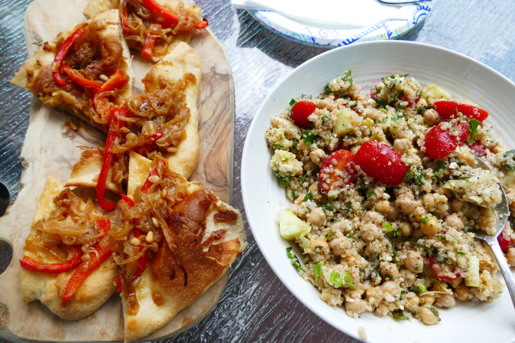 Roasted red pepper and caramelized onion flatbread, with a protein packed tabbouleh salad were the perfect light summer lunch poolside. Paired well with the Vinho Verde Rose Protein Packed Tabbouleh Salad 1 x 15oz. cans chick peas, drained and rinsed 1 1/2 cups cooked quinoa 1 cup cherry tomatoes, halved 1 cup minced fresh parsley 1/2 cup each minced fresh mint and green onions 1 small jar of marinated artichoke quarters, rinsed and drained Vinaigrette: 1/4 cup lemon juice 2 tbsp. each red wine vinegar and olive oil 1/2 cup crumbled feta cheese 1/4 tsp. each ground cumin, salt and pepper Mix all of the salad ingredients together in a bowl. Whish the vinaigrette together in a bowl. Pour over the salad and toss. Adjust seasoning to taste.