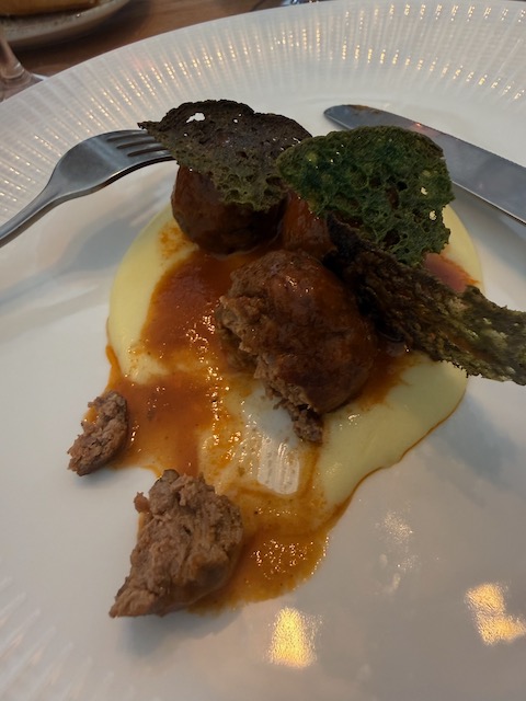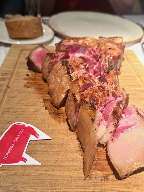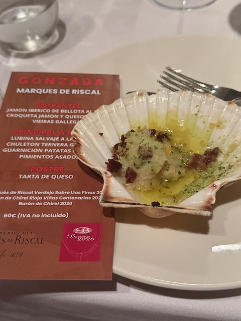 – An asador dinner at Asador Gonzaba Madrid, sponsored by Marqués de Riscal, provided a quintessential Spanish grilling experience: jamón ibérico de bellota; jamón-and-cheese croquetas; grilled Galician scallops; and a magnificent chuletón de ternera, each course enlivened by generous pours of iconic Rioja and other classic Spanish labels.