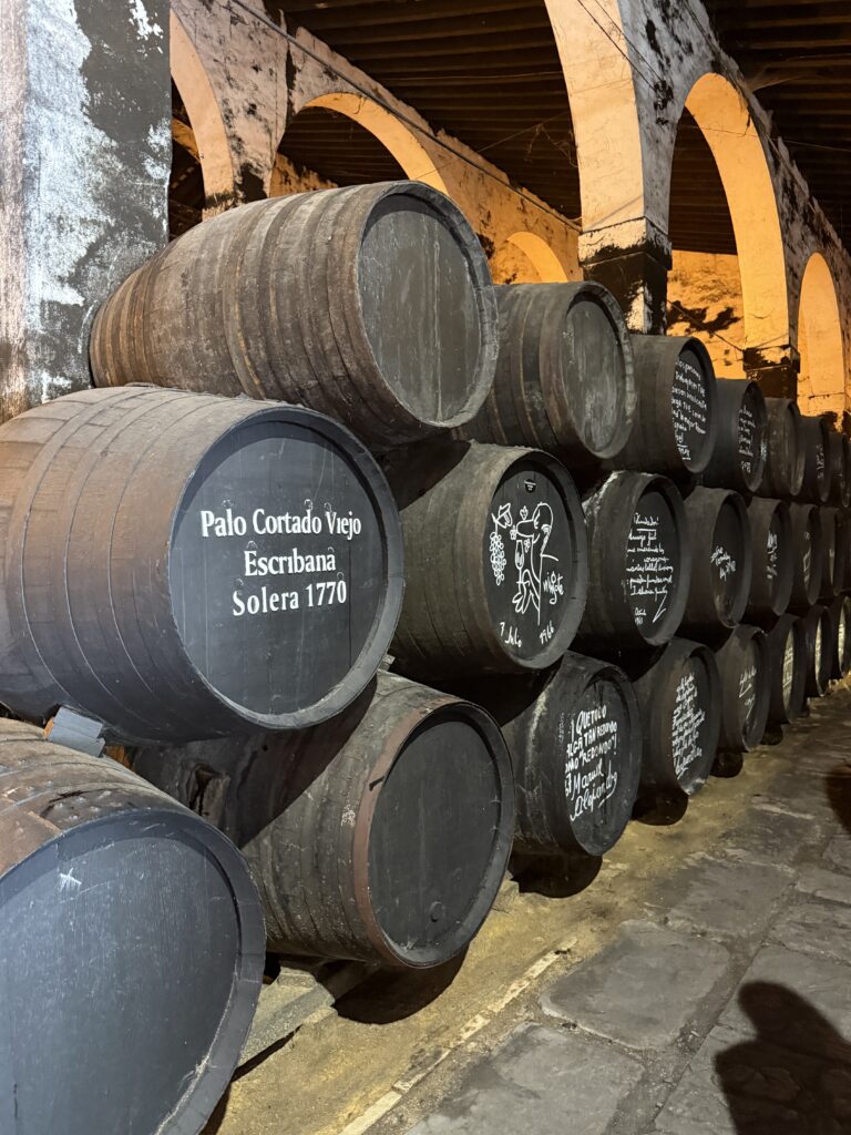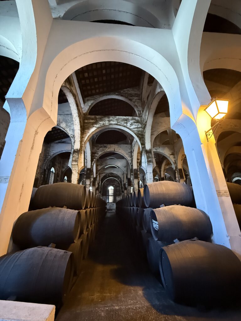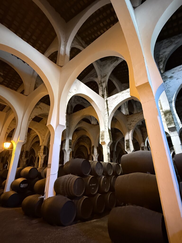 Next, we explored the historic cellars of Bodega de La Mezquita, built in 1974 with impressive mosque-style arches designed to maintain perfect humidity—a crucial element for aging. The construction ingeniously incorporates natural elements: window designs and ocean orientation for climate control. Spanning six buildings equivalent to four football fields in size, this complex—designed by Lopi Nodia over three years—blends Moorish architecture with nature, evoking a cathedral-like ambiance. Surrounded by over 40,000 sherry casks, some dating back to 1730, the scale was awe-inspiring. These casks aren’t mere storage; they’re living artifacts, seasoned like whiskey or bourbon barrels, imparting rich, layered flavors through the solera system—a tiered blending process ensuring consistent quality.