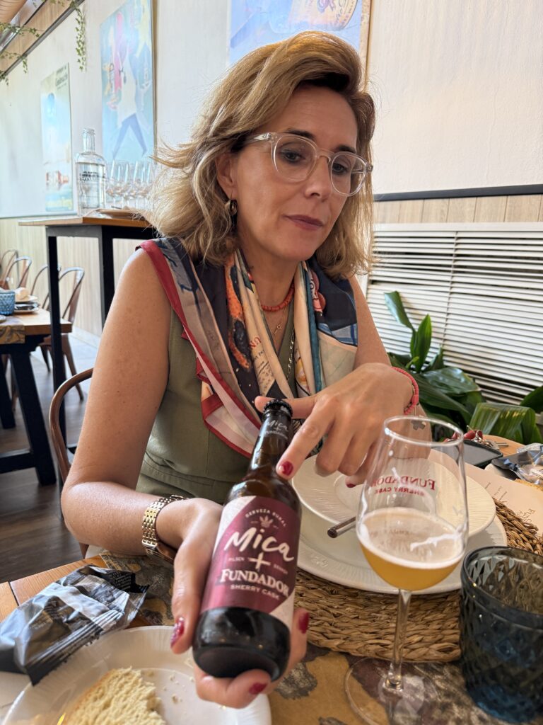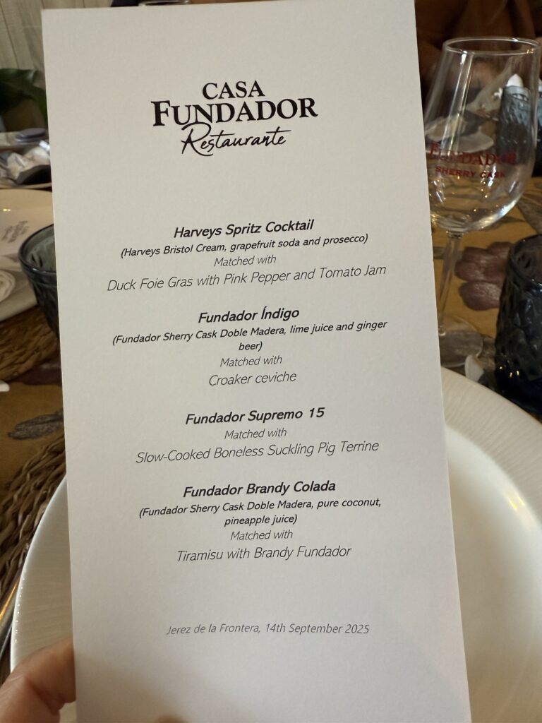 We concluded with a delightful lunch at Casa Fundador Restaurante, featuring an incredible four-course meal paired with spirits and the newly launched Mica Fundador Sherry Cask beer. This Toro Amber Ale, aged in Oloroso sherry casks, boasts a rich amber hue with notes of dried fruit, toasted almond, and oak—Spain’s most awarded craft beer! From a Harvey’s Spritz with duck foie gras, pink pepper, and tomato jam to a Fundador Brandy Colada with brandy-infused tiramisu, every element was curated flawlessly. Beatriz insisted on tasting the exceptional Fundador Supremo 30, aged for three decades: deep, refined, and balanced, rich with dried fruit, toasted oak, and subtle spice—the epitome of aged brandy.