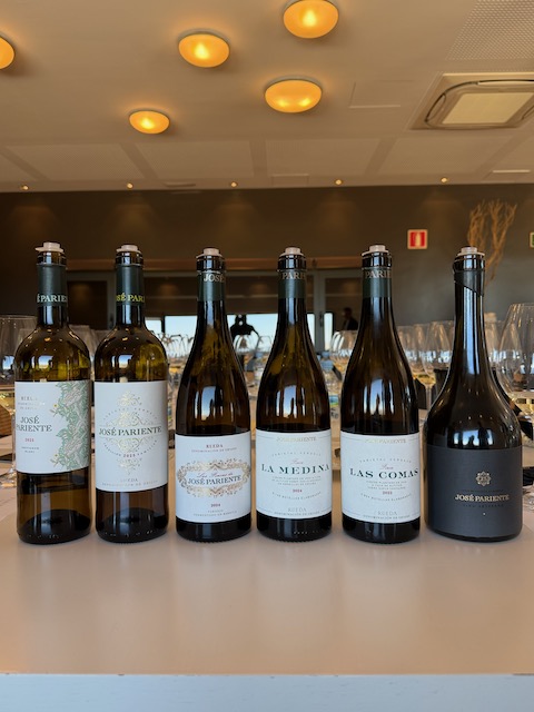 We were treated to an impressive tasting lineup straight from the photo above. The José Pariente Sauvignon Blanc linear herbal, grapefruit freshness and fresh-cut grass – electric and ridiculously refreshing. The José Pariente Varietal Verdejo delivered classic Rueda aromatic fireworks: anise, white peach, fennel and a saline minerality that screams freshness; a blend of three aging vessels – stainless steel, concrete and large oak to highlight the real character of Verdejo. As Ignacio stated “the mouth has to talk when it comes to Verdejo.” The barrel-fermented Las Fincas de José Pariente 2024 brought richer broadness with layers of toasted almond, brioche and smoky spice, yet stayed vibrant and balanced. Finca La Medina 2024 from sandy soil, aged in concrete egg showed elegant restraint yet had a wonderful density – lemon curd, eucalyptus and a striking mineral snap.