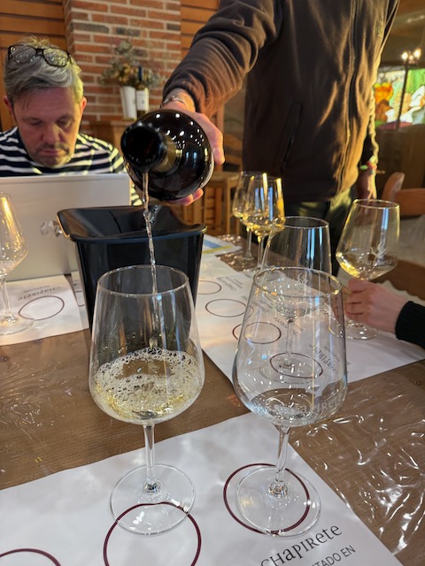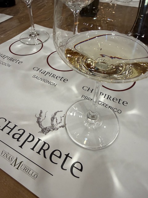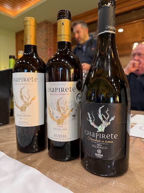 We tasted an impressive range from the Chapirete lineup. The 2025 Valdihuete served as their perfect business card — a vibrant preview of what’s to come. The 2025 Verdejo Sobre Lías hit with salty electric energy, crunchy fruit, fresh vegetal notes, peach and a whisper of smoke. The 2022 Prefiloxérico told the estate’s full story in one sip: elegant yet intense, salty and electric with turmeric, cumin and a sharp white pepper finish. The 2020 Prefiloxérico showed spicier, more opulent character — salty, honeyed ginger with a quiet, Sémillon-like sophistication. The 2021 Fermentado en Barrica coated the palate with ripe pineapple, papaya, peach, thyme, lemon curd and nutmeg. Even their 2024 Sauvignon Blanc notably fruit-forward and juicy against the intensely mineral-driven Verdejos.